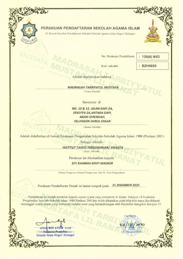 Berdaftar di bawah Majlis Agama Islam, Persatuan Institusi Tahfiz Al-Quran Negeri Selangor & Lembaga Zakat Selangor.
